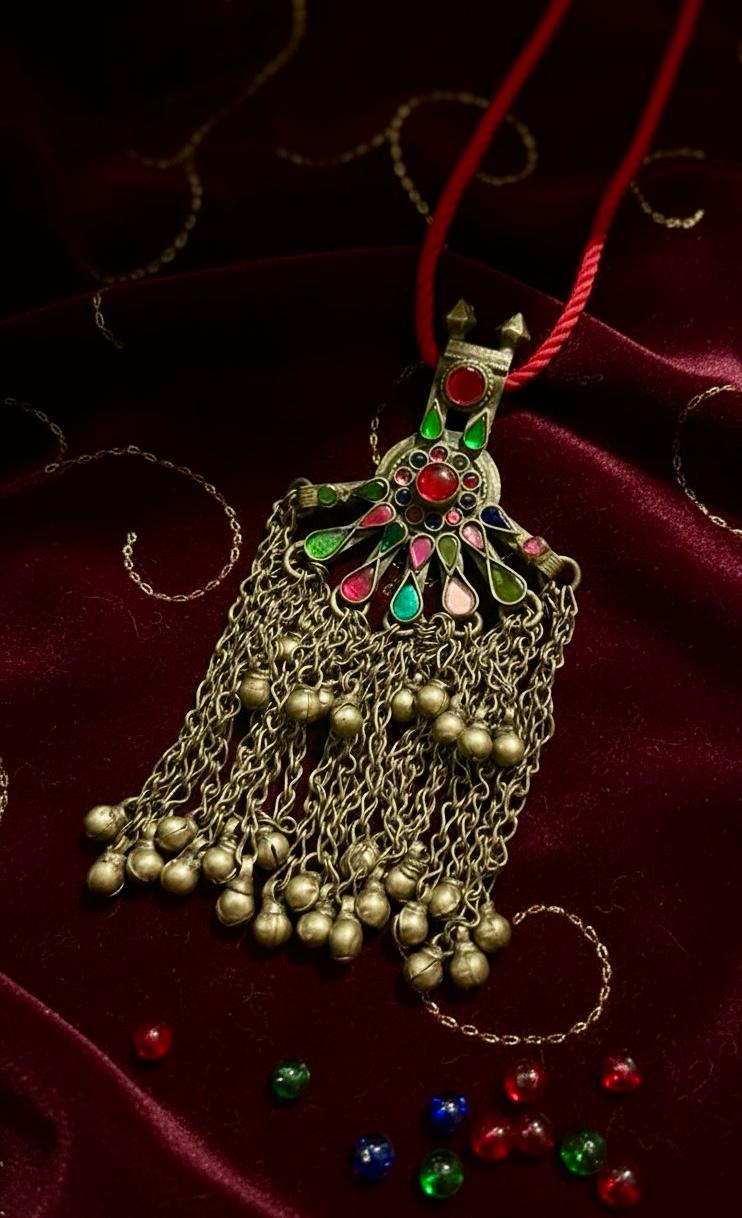 Product Description:The Farah Gul Antique Amulet Necklace features a rectangular frame with embedded glass stones and hanging brass bells. The deep symbolism of Afghan craftsmanship makes this an exquisite talismanic ornament.