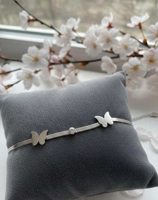 The Silver Flutter Bracelet features butterfly motifs with zircon embellishments, radiating femininity and lightness. Designed for daily elegance and timeless beauty.