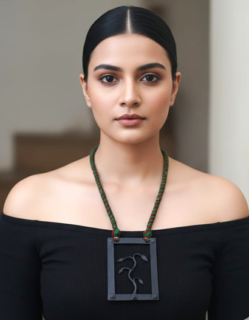 The deep matte black metal contrasts beautifully with the green and red handwoven cotton threads, echoing the tribal reverence for forests, fertility, and seasonal rhythms. Rooted in Bastar tribal artistry, this piece is more than jewelry — it is a talisman of life's continuity.
