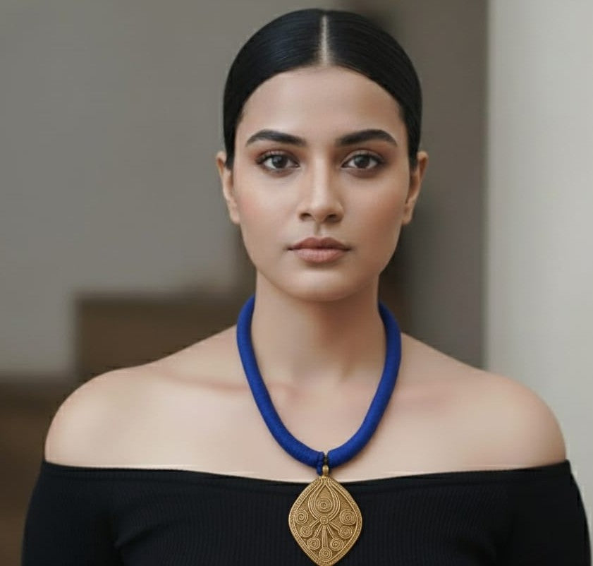 Suspended on a bold strand wrapped in deep indigo cotton thread, this piece reflects both strength and serenity, mirroring the sacred hues of sky and water. Rooted in the Santhal and Bastar tribes' spiritual designs, Shrishti is more than adornment — it is a reminder of one's eternal connection to the cosmos.