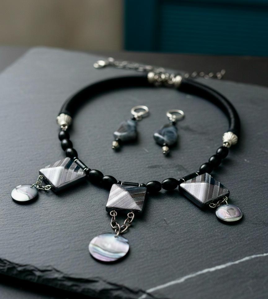 The Midnight Pearl Geometry Necklace Set is a sleek handcrafted design that blends modern geometry with timeless elegance. Featuring angular polymer clay elements, matte black beads, and delicate pearl shell drops, this necklace is paired with matching earrings for a refined yet bold look. Accented with metal alloy fittings and finished on a smooth cord base, the set offers a perfect balance of structure and fluidity. Designed for effortless sophistication, it transitions seamlessly from day wear to evening styling.