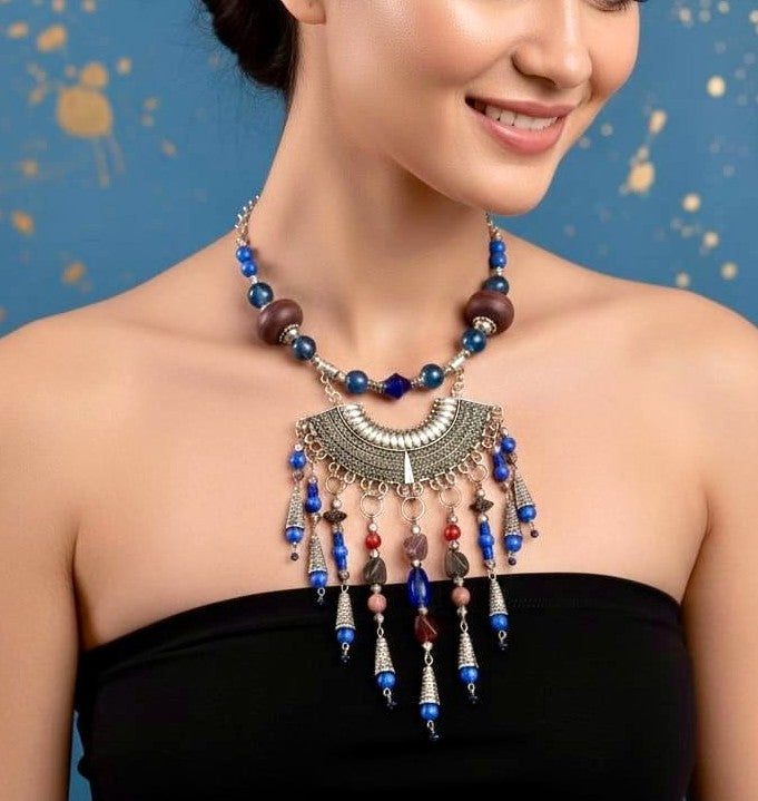 Blue-Red Multi-Dangle Tribal Necklace