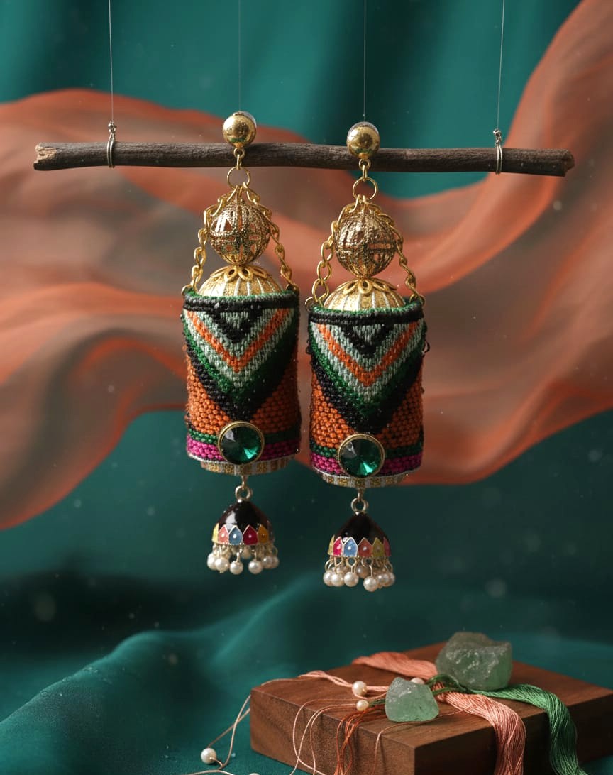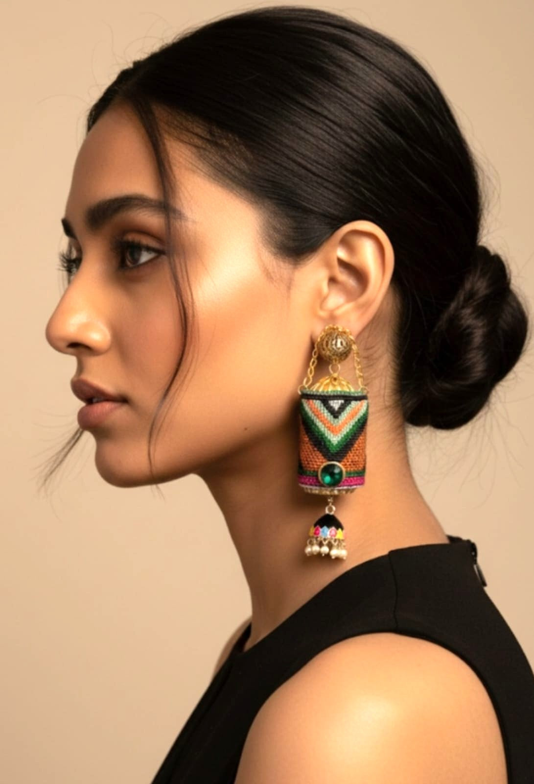 A striking premium handcrafted earring featuring intricate hand-beaded cylindrical panels with geometric tribal patterns, accented by a central emerald-toned stone and finished with a delicate jhumka drop adorned with pearls. The antique gold-tone hardware and vibrant beadwork create a bold fusion of folk artistry and contemporary luxury. Styling Tip: Pair with solid-colored sarees, silk kurtas, or minimalist gowns. Best worn with tied-back hair or sleek buns to highlight the craftsmanship.