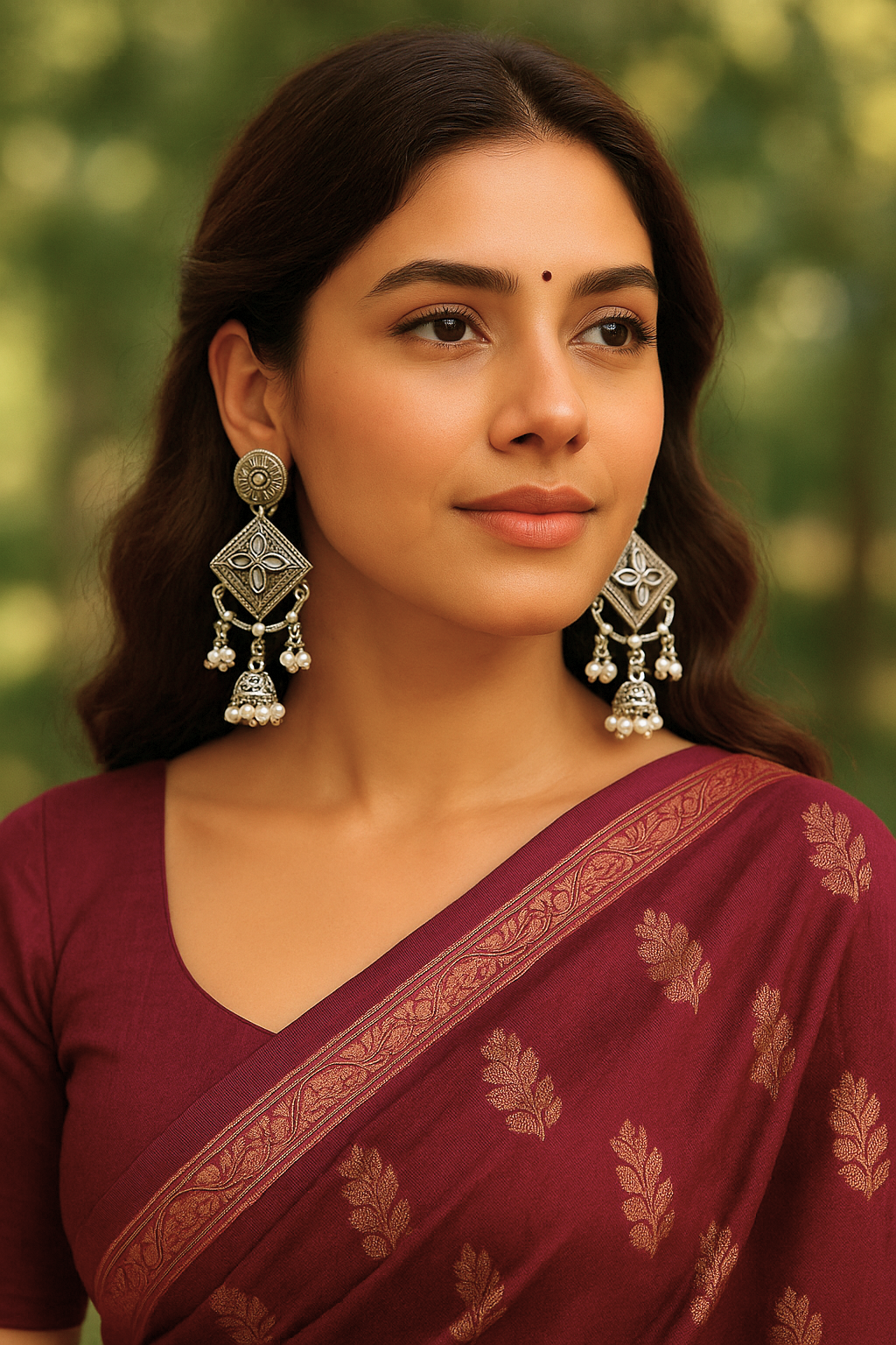 Rooted in tradition yet refined with modern charm, the Amara Jhumkas evoke a timeless allure. Featuring a bold diamond-shaped motif adorned with deep crimson stones and delicate floral engravings, these oxidized silver earrings cascade into classic pearl-laden jhumkas — a graceful blend of heritage and elegance.