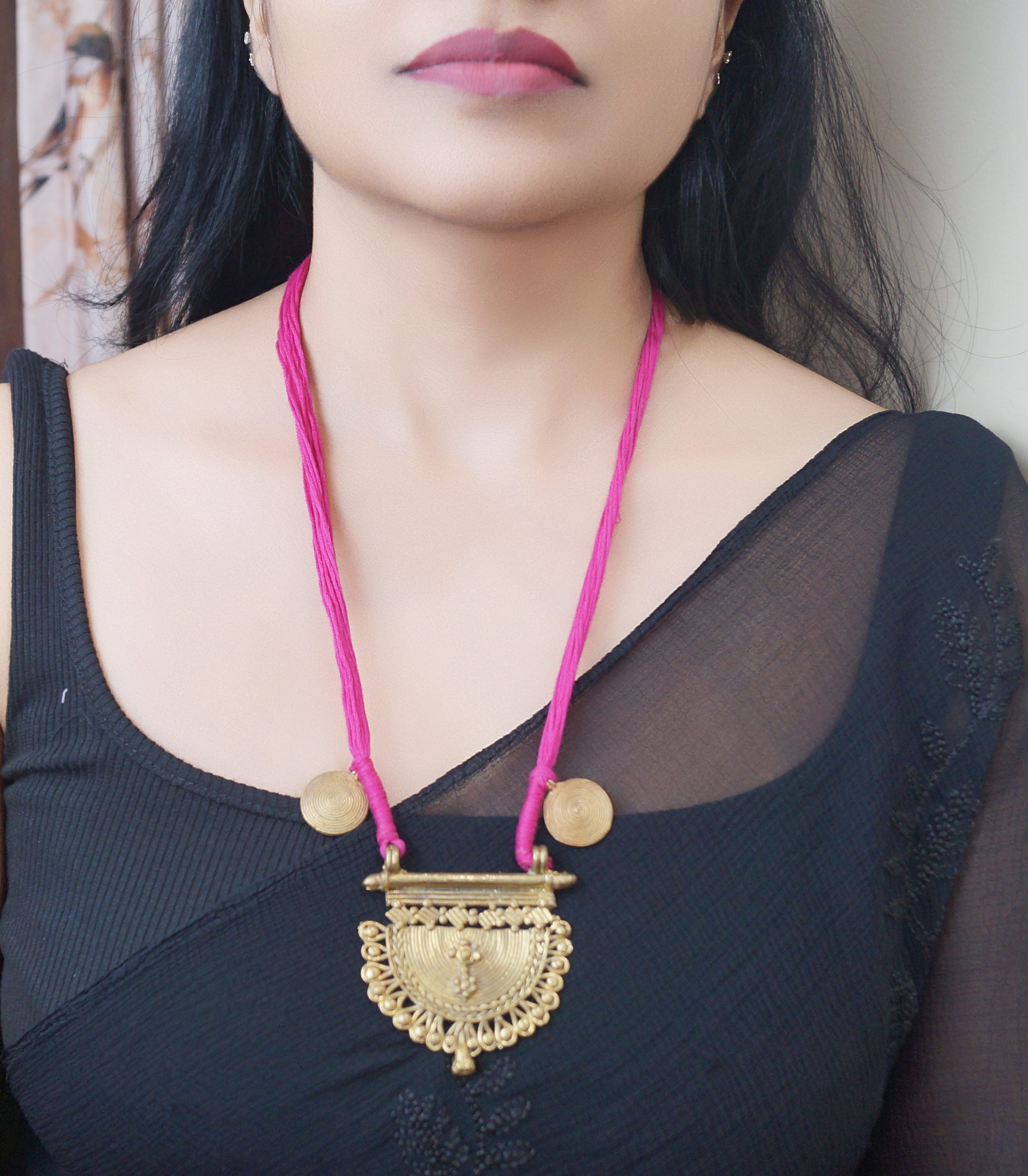 Crafted through the lost-wax casting method, the pendant is not just ornamentation but an imprint of ancestral hands and stories. The twin spiral discs on each side add rhythm and balance, while the soft pink handspun cotton threads symbolize grace, softness, and strength.