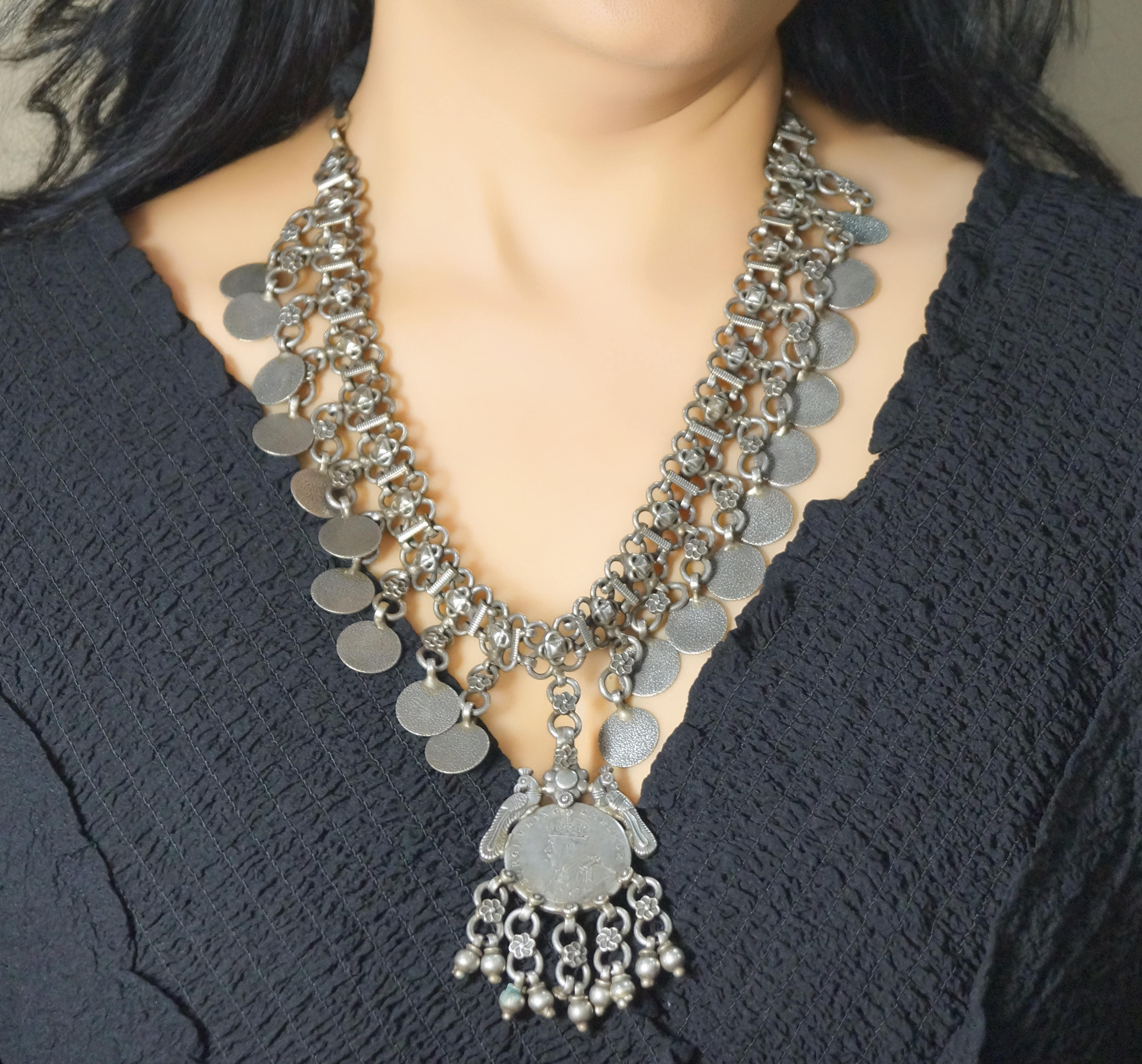 Adorned with textured coin motifs, floral connectors, and a majestic British-era replica pendant, this design pays tribute to ancestral artistry and storytelling. Every jingle, every detail, evokes echoes of the past while making a bold statement in the present.