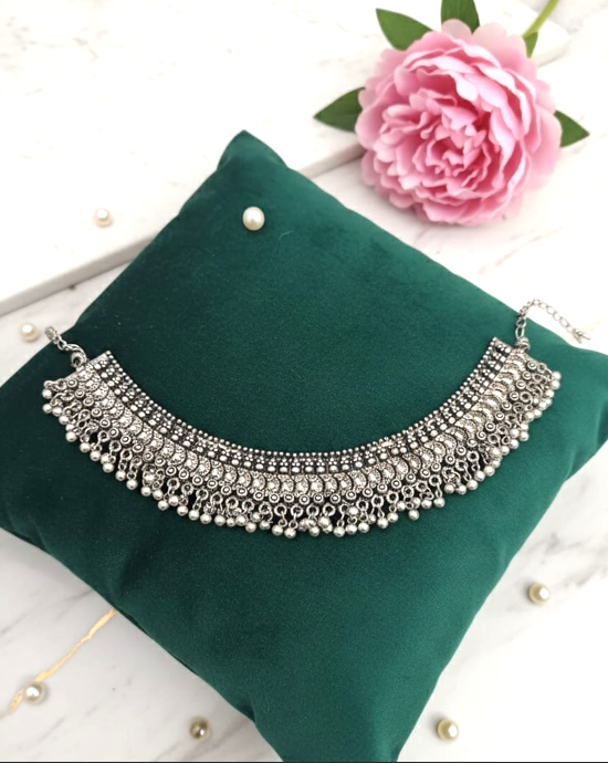 A beautifully handcrafted oxidised silver choker featuring dense ghungroo detailing. Perfect for festive outfits, sarees, and indo-western styling. Can instantly elevate even a simple look.