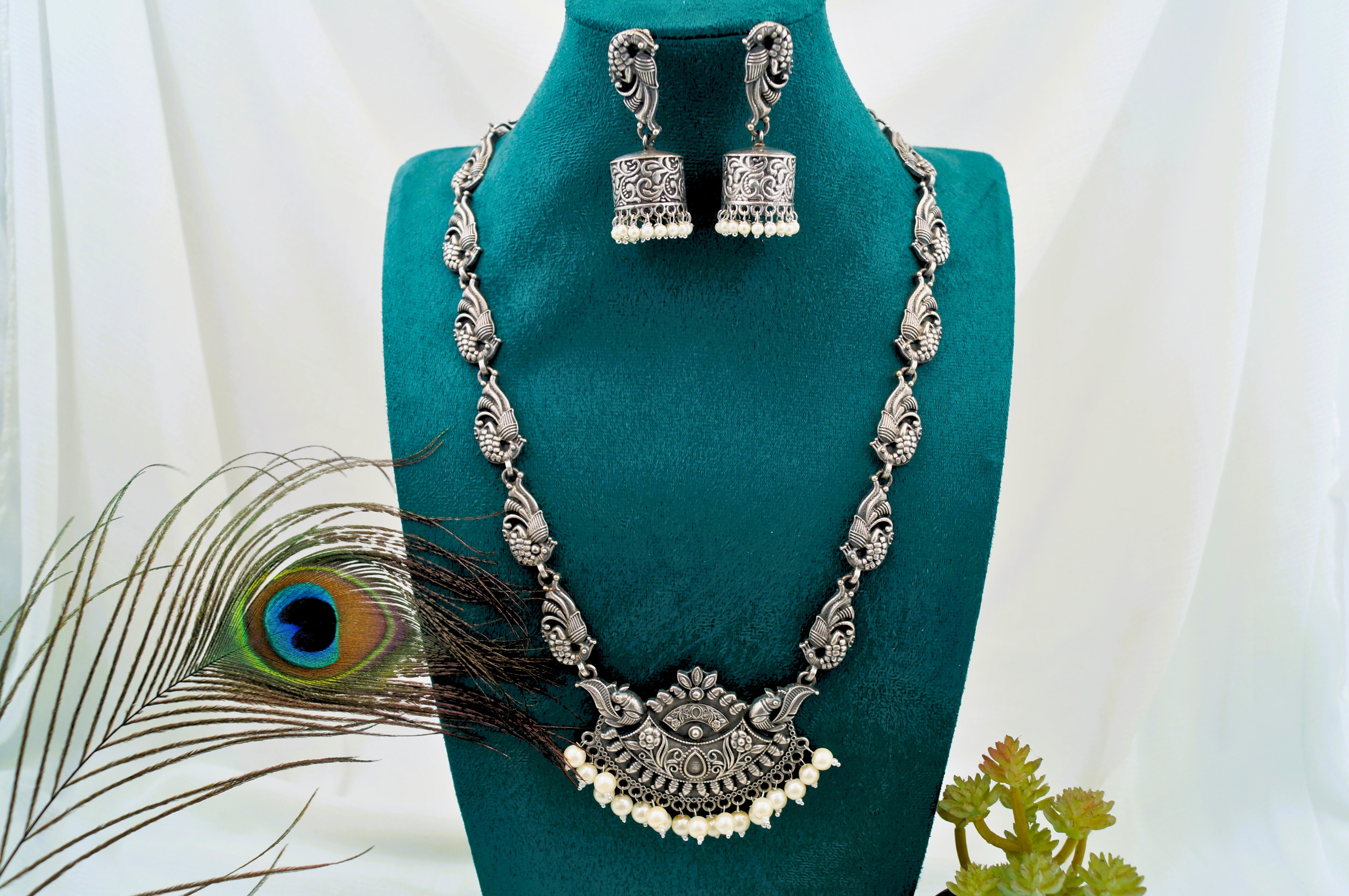 Celebrate divine feminine strength with the Rudra Deviya Hasli Set — a bold and majestic oxidised necklace set inspired by temple heritage. The necklace features a grand pendant showcasing Goddess Lakshmi seated in grace, flanked by intricate floral and peacock motifs along the chain. The bottom is adorned with ghungroo-style pearl drops that add soft movement and tradition to every step you take.